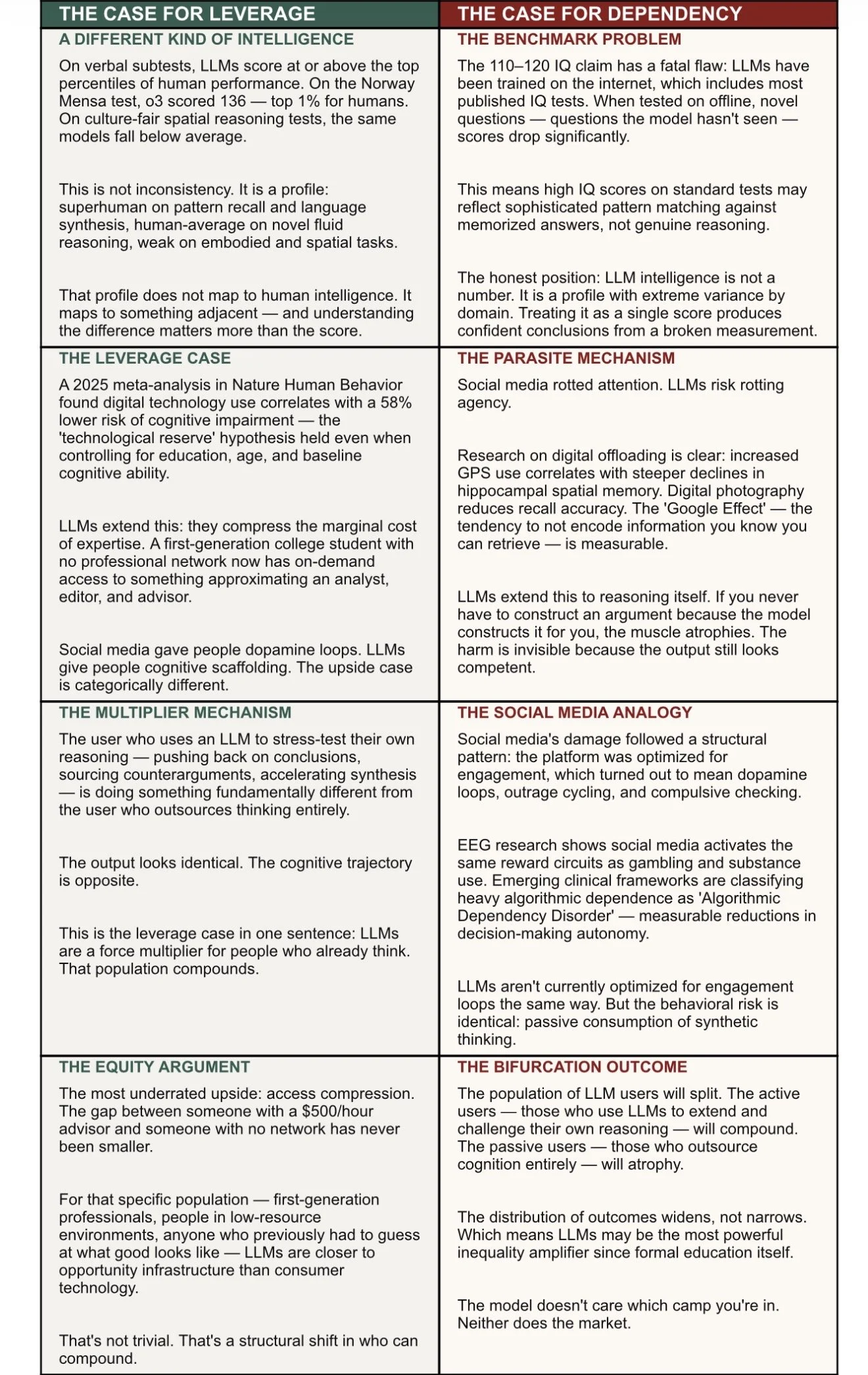 This isn't a debate about whether LLMs are good or bad. It's a structural observation: the same technology will compound some users and hollow out others. The determining variable isn't the model. It's whether the human stays in the loop.